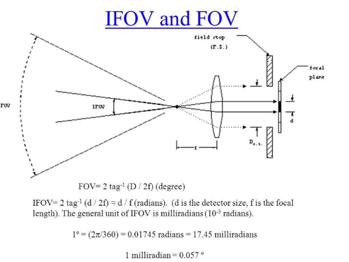 瞬時視場角指的是傳感器內(nèi)單個探測元件的受光角度或觀測視野,它決定了在給定高度上瞬間觀測的地表面積,這個面積就是傳感器所能分辨的最小單元。IFOV越小,最小可分辨單元越小,圖像空間分辨率越高。IFOV取決于傳感器光學(xué)系統(tǒng)和探測器分辨率的大小。