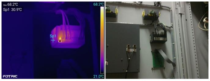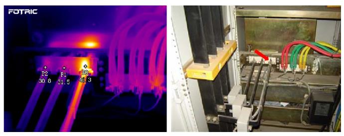 這是一個開關(guān)盒,熱像儀測出高溫點(紅三角處)達(dá)68.2℃,而盒體的正常溫度只有30.9℃,表明存在異常。高溫點位置在A接頭附近,假如是接頭異常導(dǎo)致,那么接頭那根線將會呈現(xiàn)溫度遞減的現(xiàn)象,而圖中并非如此,且最高溫并未與A接頭完全重合,由此判斷,可能是內(nèi)部問題。